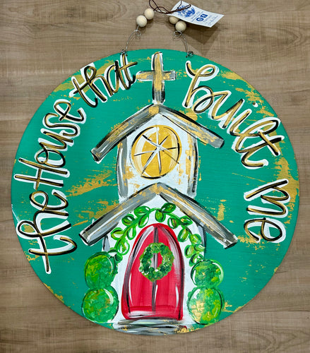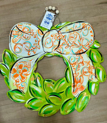 Wreath door hanger with orange chinoiserie bow and gold accents